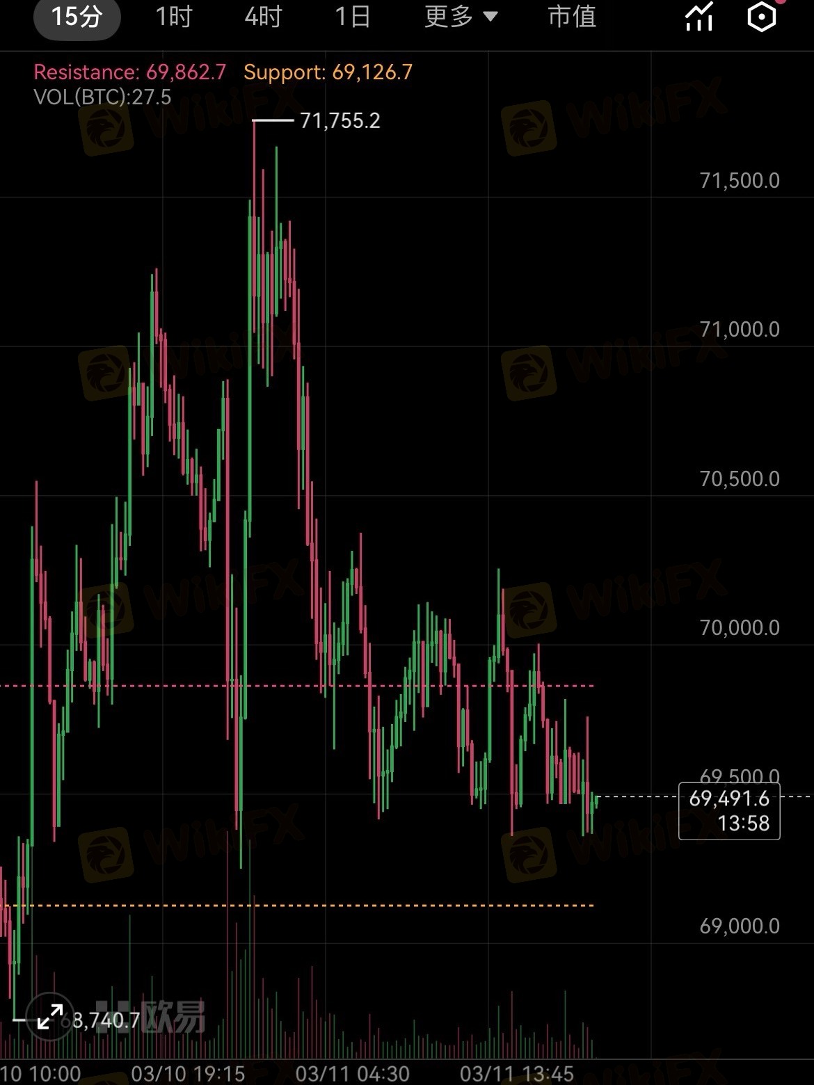 69212 支撑多次回踩未破,但迟迟不拉升,资金意图不明,暂时观望最稳。