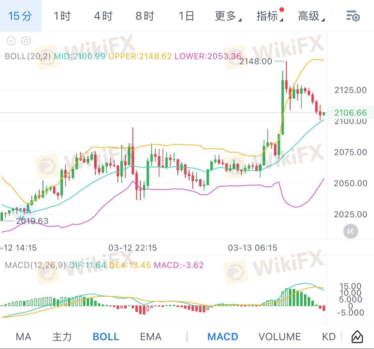 短线价格冲高至布林带上轨2148.62附近后回落,当前价格2106.66,上轨压制力度显现,MACD出现死叉信号(DIF:11.64 < DEA:13.45,MACD柱翻绿),短期多头动能衰减,存在回调修复预期。