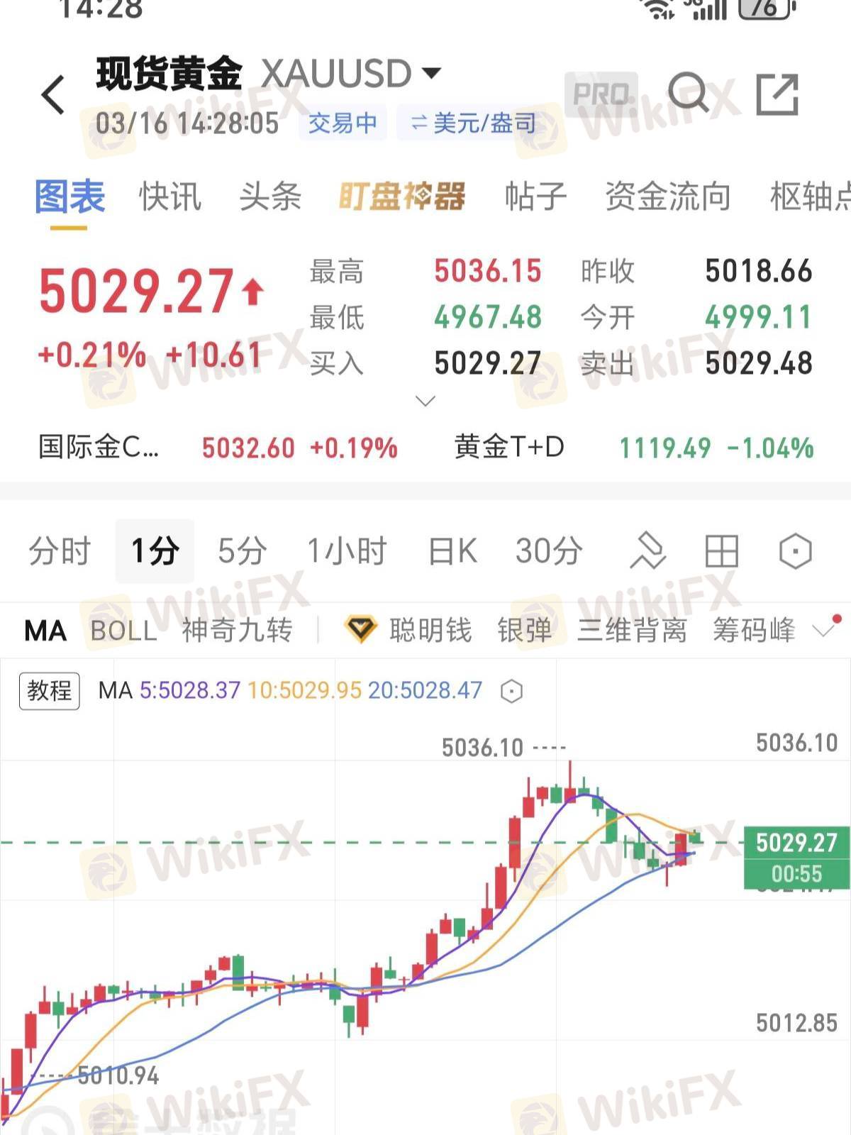 早盘黄金跳空低开,下探4967一线后展开反弹,目前交投于5016附近。多空力量在5000—5030核心区间激烈拉锯,短线分歧加剧,盘面呈现震荡偏空格局。
