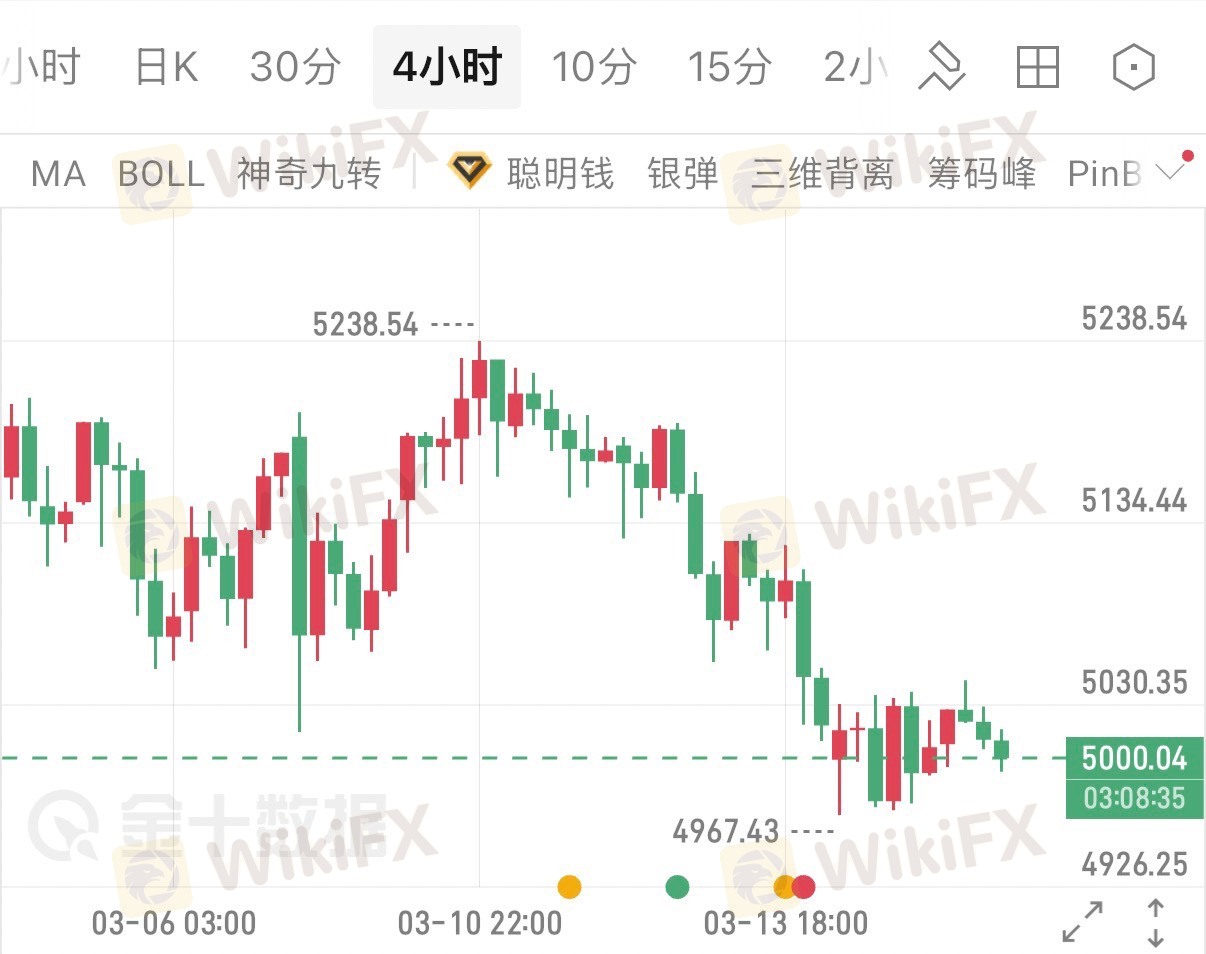 价格自高位5238.54回落,连续下破关键支撑位,目前在5000关口附近震荡,最低触及4967.43,形成清晰的下行通道。