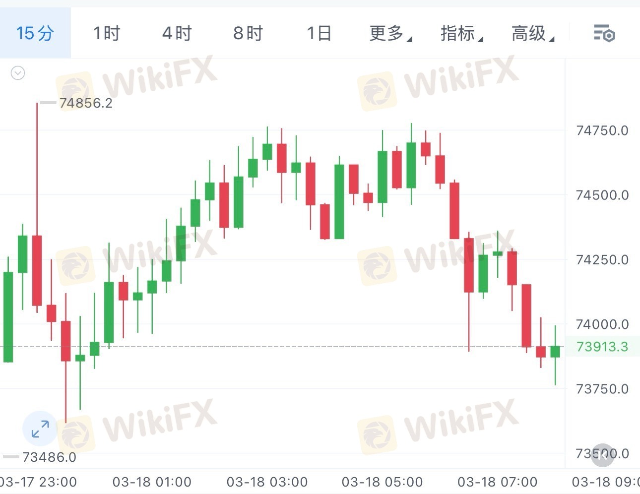 经过连续冲高后,多头动能已明显出现衰减,目前在74000附近震荡整理,多空进入观望阶段,耐心等待方向选择。