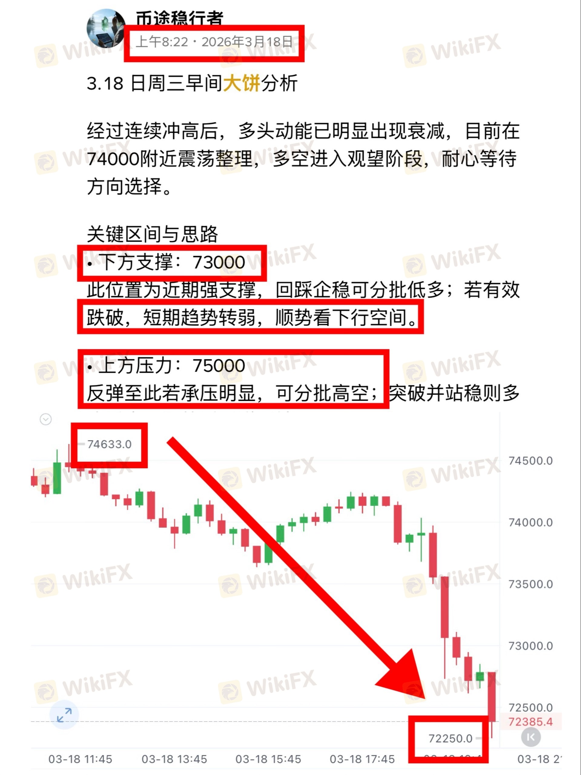 丝路明确提示75000压力明显可布局空单,下方支撑73000,跌破则趋势转弱,下行空间继续打开