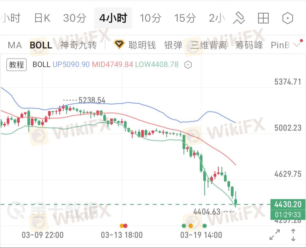 金价触及布林带下轨附近,当前现价4430.20,下轨支撑力度显现,下方支撑关注4405前期低点,上方压力看至4500整数关口及布林带中轨4750