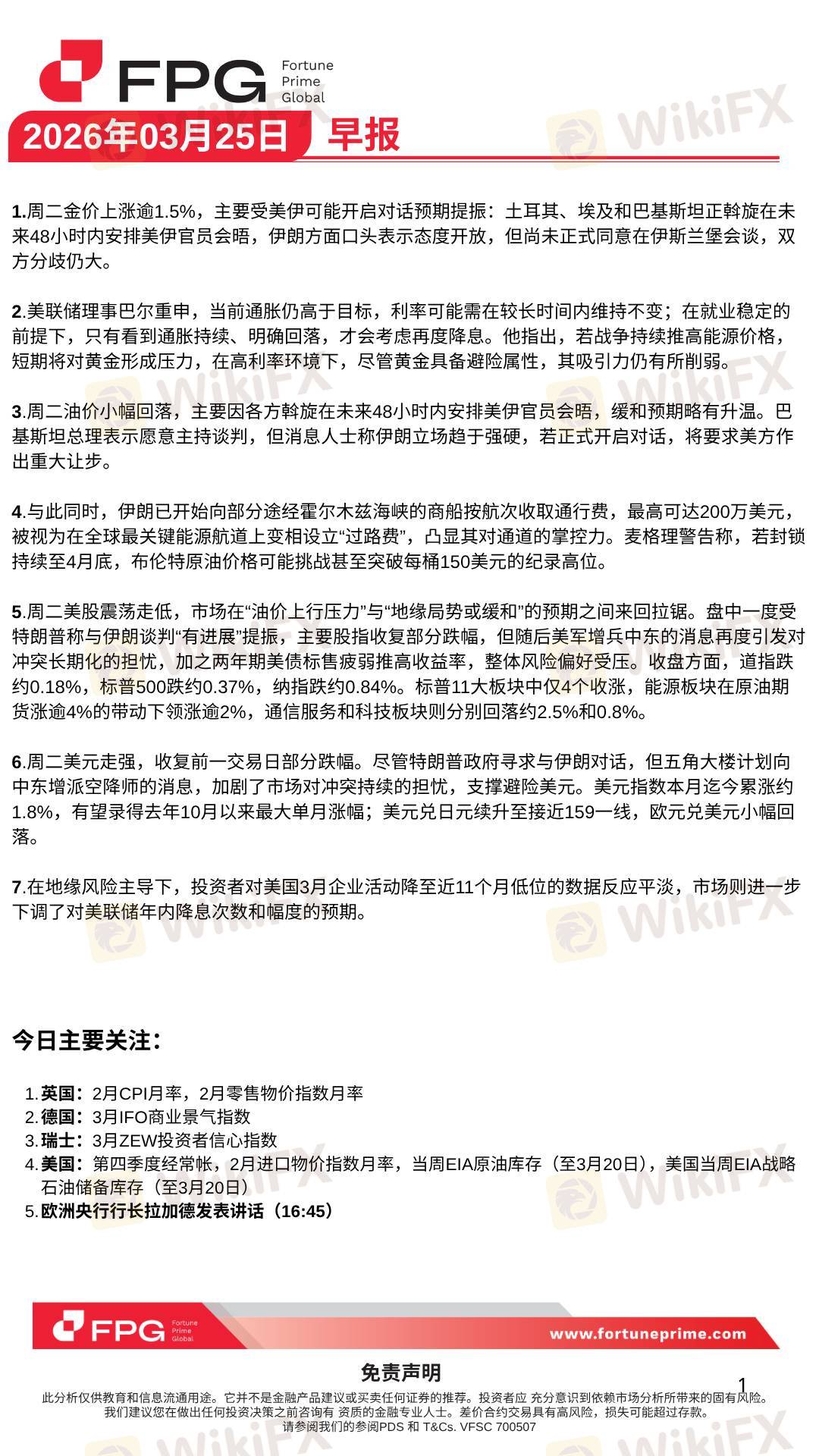 1️⃣ 黄金 - 金价周二涨逾1.5%,主要受“美伊或开启对话”预期提振(多国斡旋,伊朗口头态度开放,但暂未正式拍板,会谈前景仍存变数)。 - 美联储理事巴尔重申:通胀仍偏高,利率可能需在较长时间内维持不变;只有在就业稳定、且看到通胀持续、明确回落后,才会考虑再降息。 - 若战争持续推高能源价格,高利率+通胀压力短期仍对黄金不利,黄金虽具避险属性,但在高利率环境下吸引力减弱。 2️⃣ 原油 - 油价周二小幅回落,原因同样来自市场对美伊谈判的缓和预期。 - 伊朗开始向途经霍尔木兹海峡的部分商船收取高额通行费,被视为在关键能源航道上设立“变相过路费”,展示对水道的掌控力。 - 麦格理警告:若封锁持续至4月底,布伦特原油不排除挑战甚至突破150美元/桶历史高位的可能。 3️⃣ 美股 - 美股周二震荡收低,市场在“油价上行 → 通胀压力”与“美伊或和谈 → 风险缓和”之间反复博弈。 - 特朗普称谈判“有进展”一度提振指数,但美军增兵中东的消息又引发对冲突长期化的担忧,加上两年期美债标售疲弱推高收益率,整体风险偏好承压。 - 收盘:道指约 -0.18%,标普约 -0.37%,纳指约 -0.84%;能源板块在油价上涨带动下领涨,科技与通信服务回调居前。 4️⃣ 外汇 & 利率预期 - 美元周二走强,基本收复前一交易日跌幅,美元指数本月累计涨幅接近 1.8%,有望创去年10月以来最大单月涨幅;美元兑日元逼近159,欧元小幅走弱。 - 在地缘风险主导下,市场对美国3月企业活动降至近11个月低点的疲软数据反应平淡,反而进一步下调了对美联储年内降息次数和幅度的预期。 📌 交易提示: 地缘局势+油价与利率预期“三重博弈”,短期波动仍偏大,建议控制仓位、严设止损,谨慎隔夜与周末持仓。
