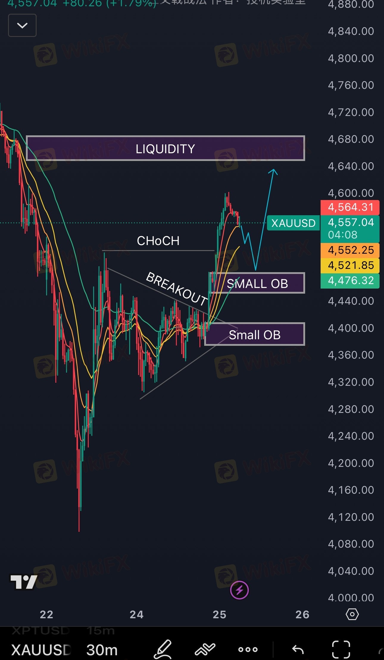 黄金短线出现转多结构,在强势上破后形成CHoCH + breakout,目前在触及高点后进入回调阶段,预期回踩后继续上行。