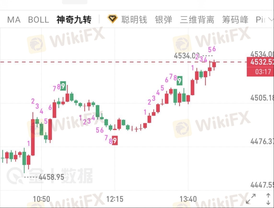 早间黄金5分钟周期先走出一波下探行情,最低触及4419附近,随后企稳逐步反弹,最高上探至4517附近,整体呈现V型反转形态。金价在布林带中轨位置反复拉锯,多空争夺较为激烈。