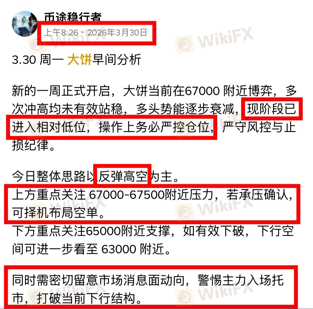 今日整体思路围绕反弹做空展开,给出上方压力67000–67500,同时提示当前处于相对低位,需警惕主力进场托底。