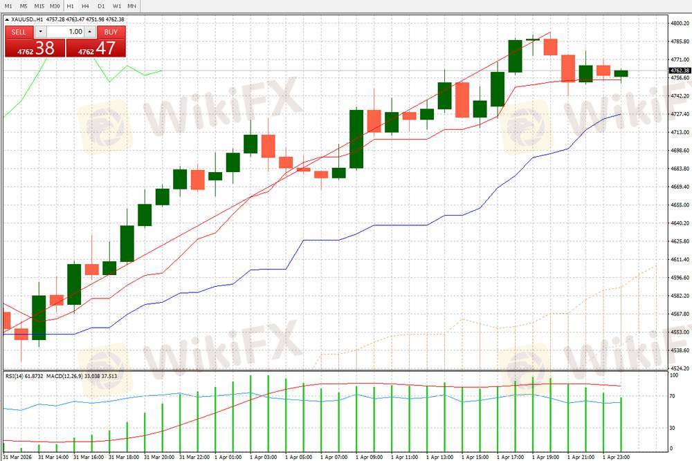 当前 XAUUSD(黄金兑美元)1 小时周期呈现高位震荡、上涨动能阶段性衰减的格局。截至最新 K 线,价格报 4762.38,此前一轮单边上行行情已触及阶段高位,短期进入回调与蓄力的博弈阶段,多空力量在高位区域展开拉锯。