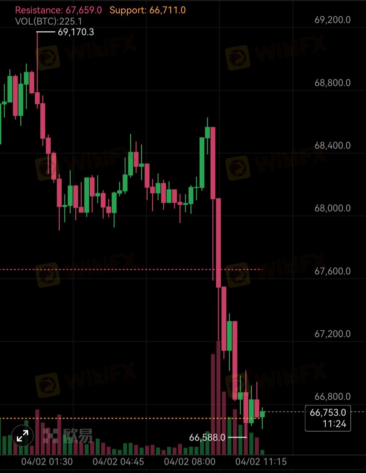 大饼两次冲69326都没过去,走出双针探顶,本来就有回调压力,先回踩了旗形下沿支撑,反弹没能站上68545,所以在68200附近顺势做了一手空,紧接着特朗普讲话,直接砸穿旗形区间,67567支撑失守,跌到66700附近。