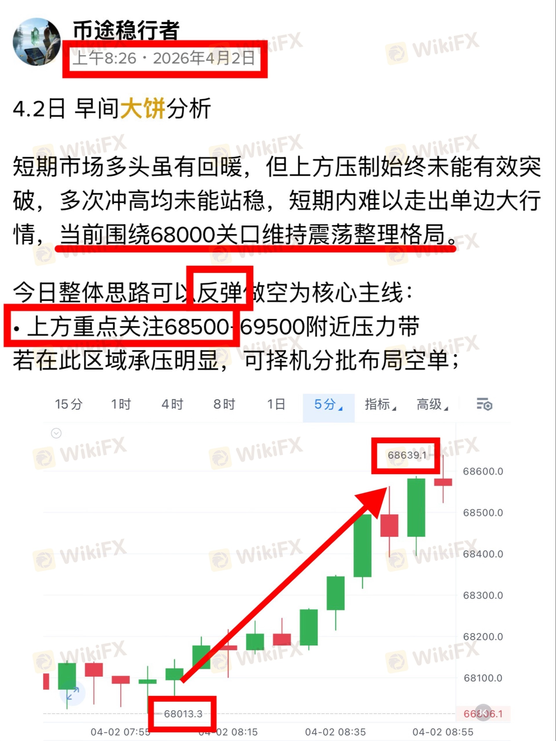 行情自68000附近启动反弹,最高触及68639,六百点空间完全符合预判。