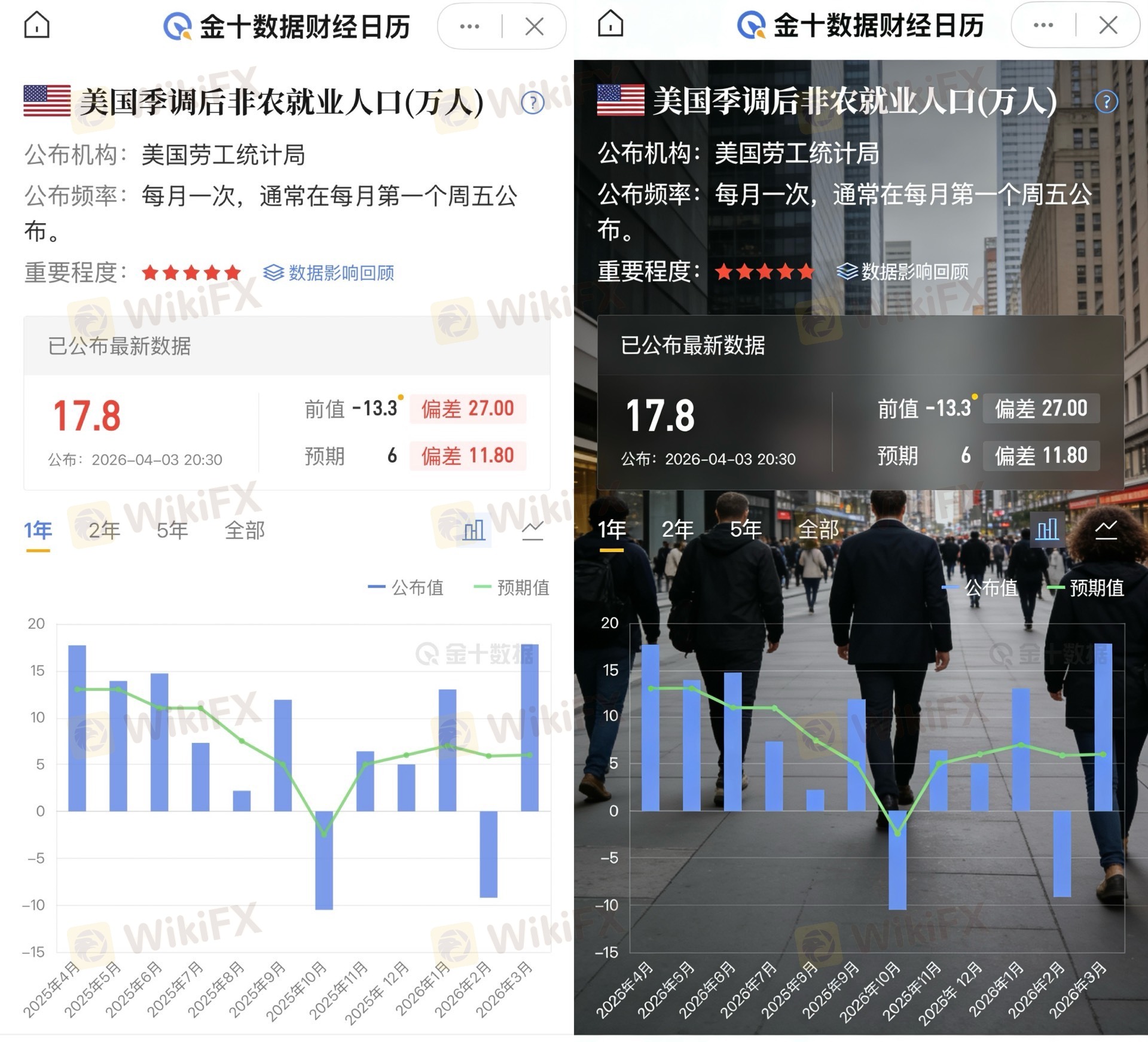 • 数据结果:3月季调后非农就业人口录得17.8万人,大幅超市场预期的6万人,前值-13.3万大幅上修,属于极强的就业数据