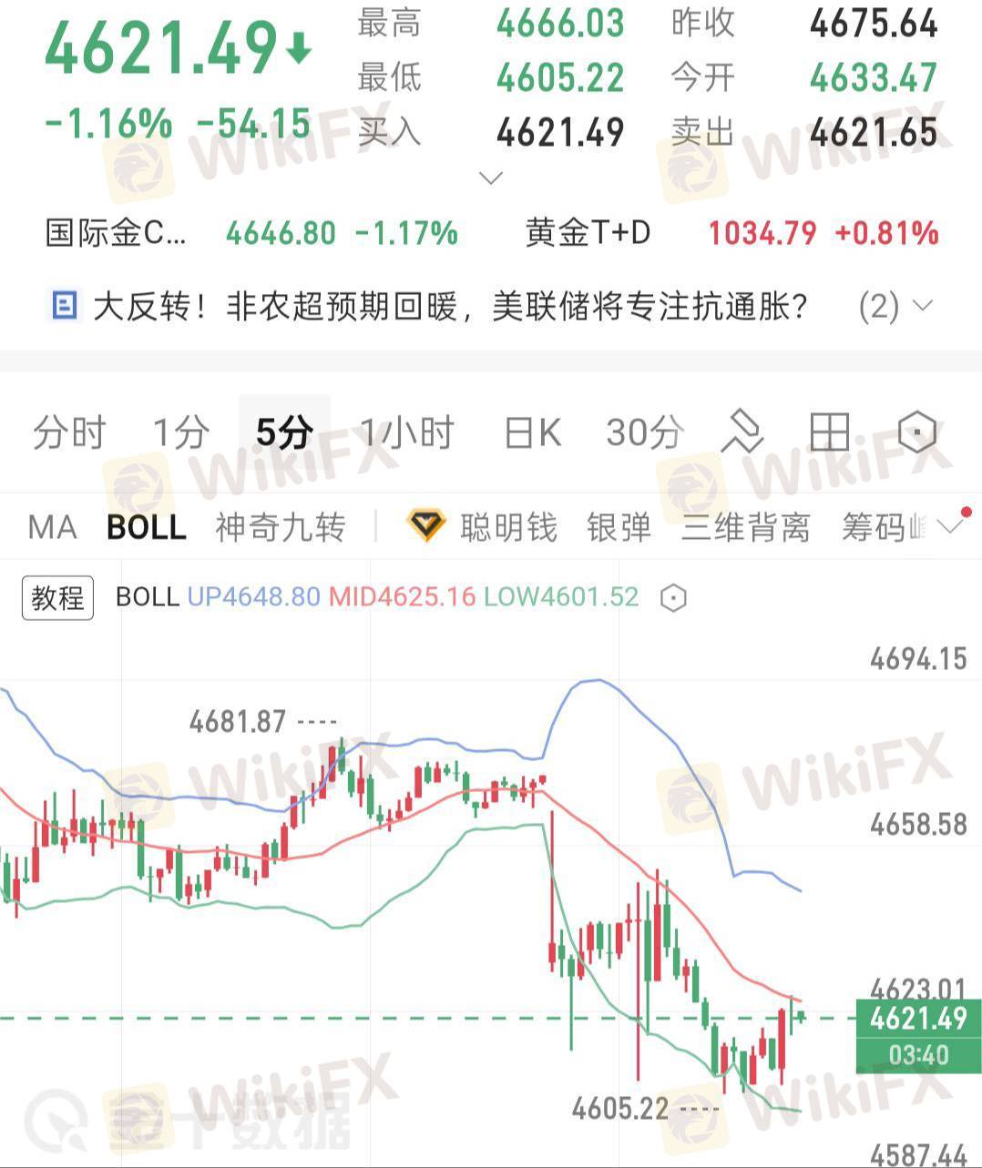 早间开盘跳空低开,最低触及4608,当前在4610附近窄幅震荡。非农爆表+特朗普言论双重利空释放,短线空头主导,指标超卖存在修复需求,中东避险支撑有限。日内无重大数据,以技术面震荡修复为主。