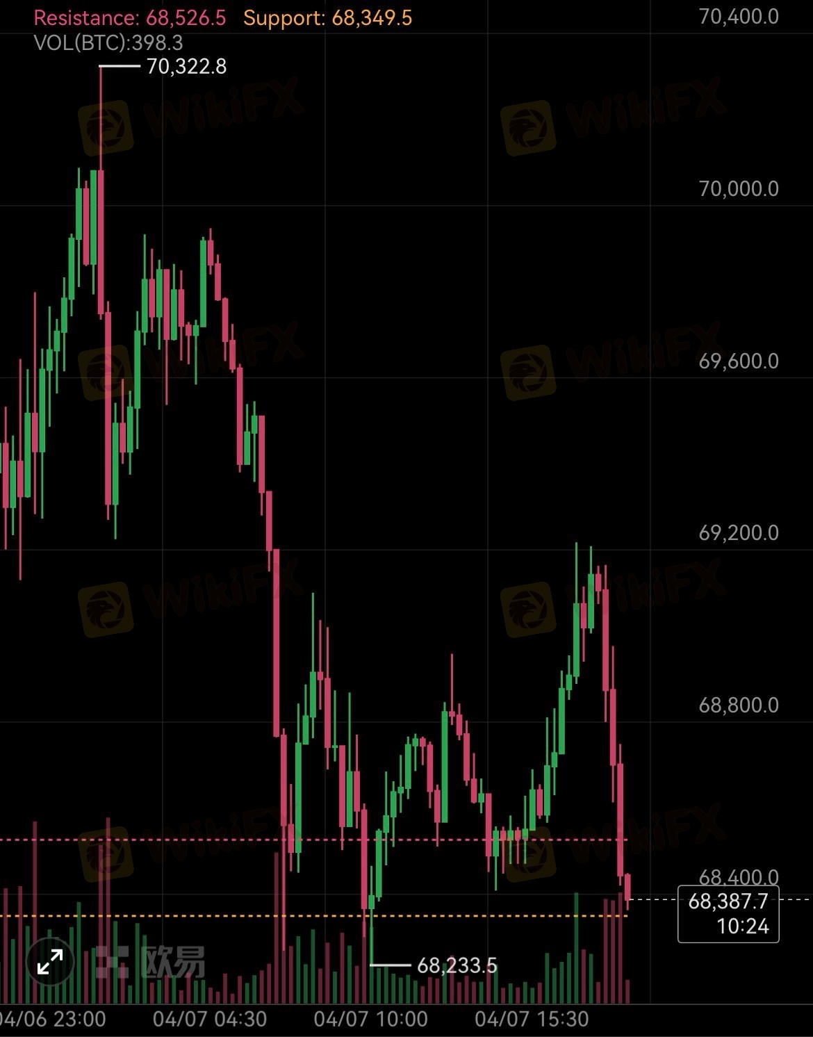 该位置附近收出锤形K线,直观体现下方买盘支撑较强,空头多次尝试下探均未能有效击穿,最终被多头拉回,多头力量明显占优。后续反弹至69159附近遇阻收出流星线,确认此处为短期强压力位,价格再度回落,但依旧守住68254支撑。