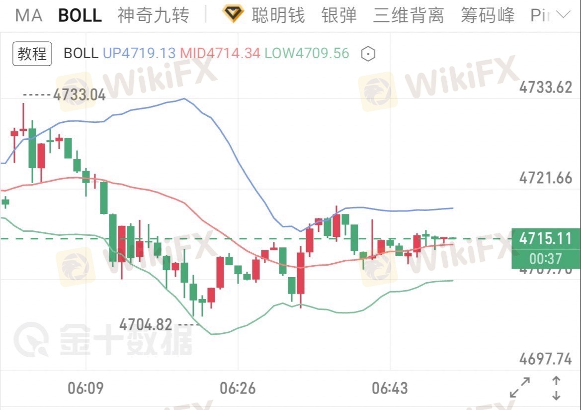 金价沿布林带下轨下行,布林带开口向下、均线空头
