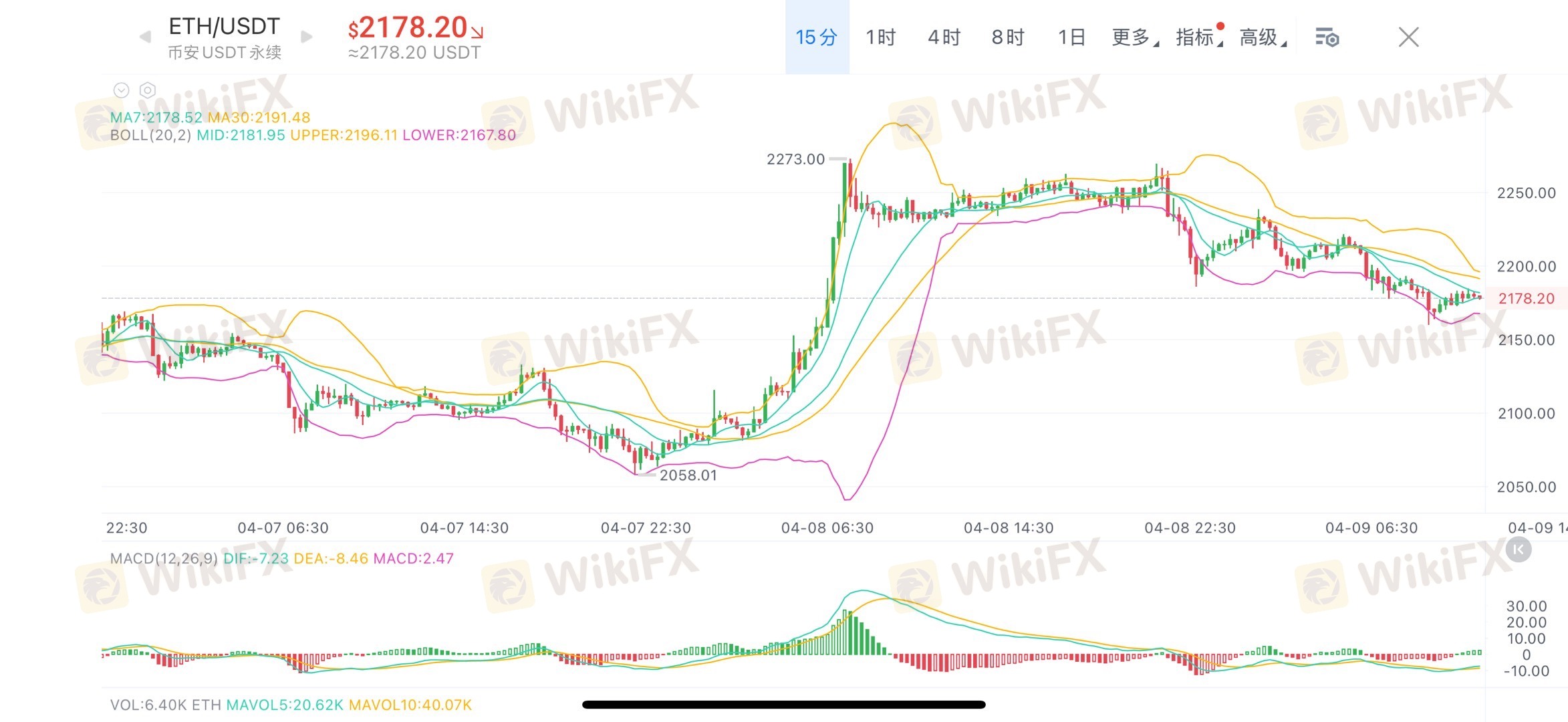 短线自2273.00高点回落,最低下探2058.01后震荡回升,当前价格2178.20附近,布林带整体开口收窄,价格在中轨2181.95下方运行,反弹持续承压于中轨;MACD双线在零轴附近走弱,红柱持续缩量,多头动能逐步衰减,成交量萎缩,无量反弹难以持续,整体处于上涨后的高位弱势修复格局。
