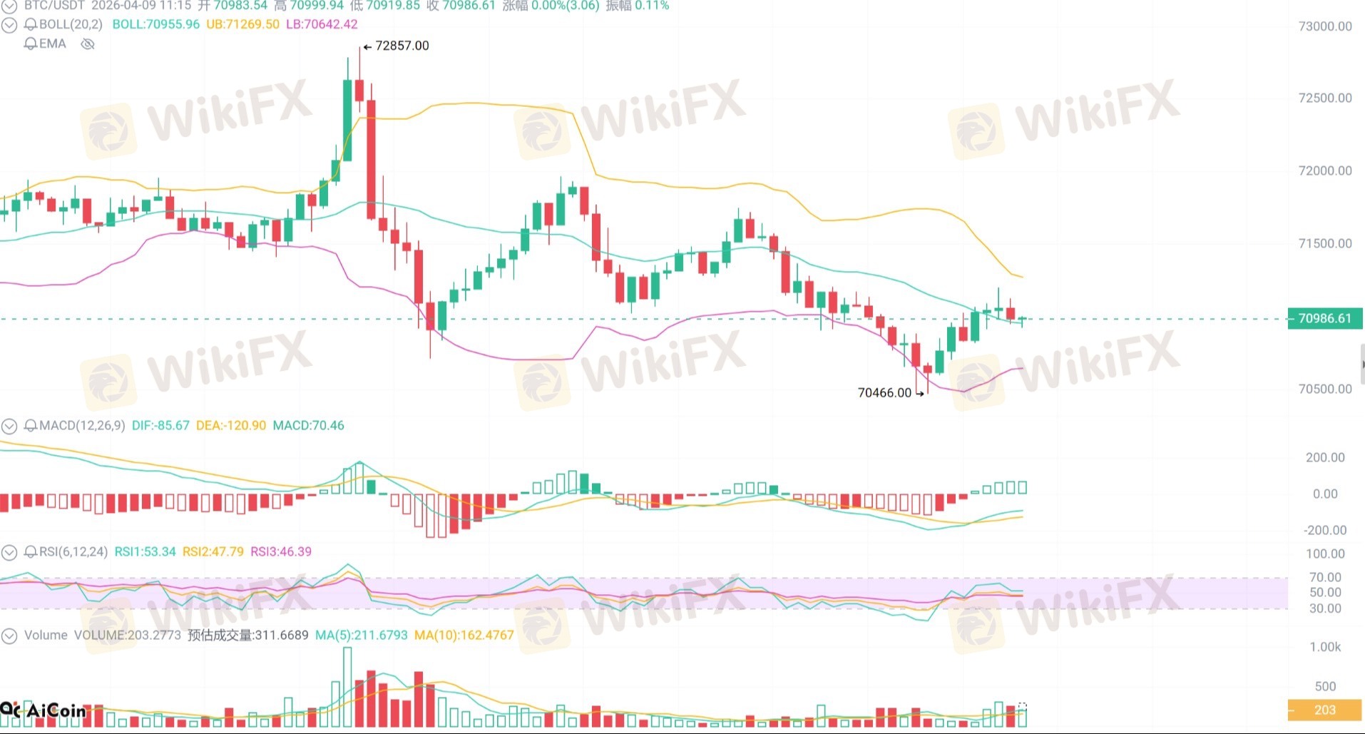 4/9大餅午間分析: ✅午間策略(實操) 低多:回踩 70000–69500 企穩做多 止損:69000(有效破位) 目標:71500 → 72500 高空:反彈 72500–73000 承壓做空 止損:73500(突破前高) 目標:71000 → 70000 破位:跌破 69000 → 轉弱,下看 68000 突破:站穩 73000 → 打開上行空間 技術面: 4小時:72800 長上影承壓;MACD金叉但動能減弱 1小時:70500–72000 窄幅震盪;布林收口、量能萎縮 午間關鍵位 第一壓力:72000–72500 強壓:72800–73000(前高+套牢盤) 第一支撐:70500–70000(心理關口) 強支撐:69500–69000 消息面(核心) 利空:霍爾木茲海峽再次關閉 中性:BTC ETF資金溫和流入、鏈上數據穩定 隱憂:美聯儲降息預期不穩、美債收益率反彈 #BTCUSD