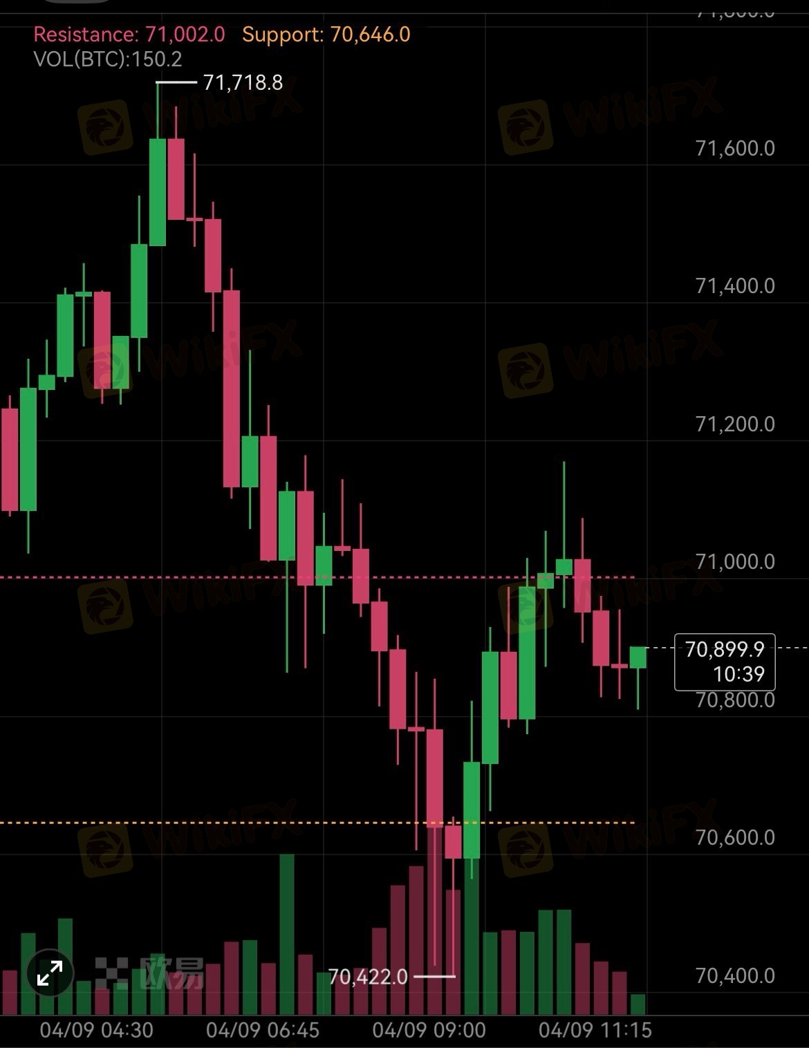 守住7万整体偏震荡;有效跌破7万,跌幅扩大,下看69134支撑