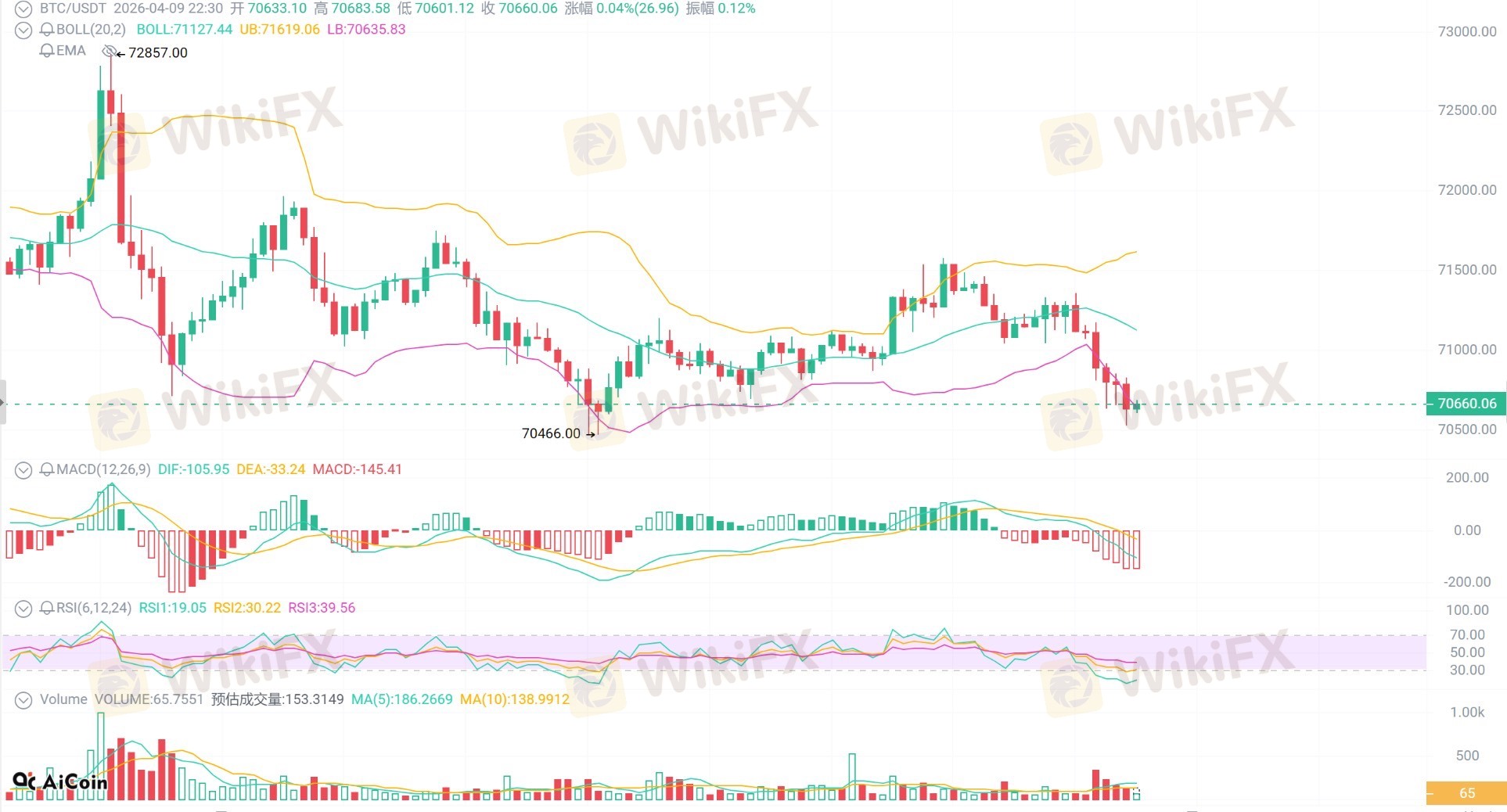 支撑位:中轨≈70800(临界);第一支撑70500~70600(现价附近);强支撑70000(整数关口)
