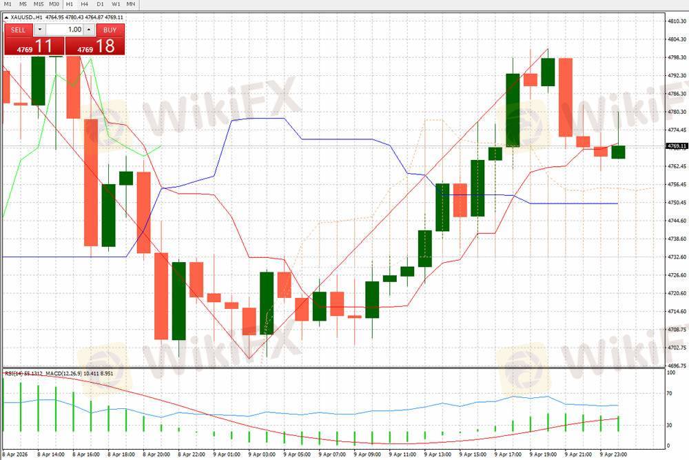 截至 4 月 10 日早盘,伦敦现货黄金交投于 4769 美元 / 盎司附近,日内最高触及 4801 美元,最低下探 4698 美元,整体呈现 “冲高回落、震荡整理” 的格局。从 1 小时 K 线图来看,金价在前期完成一轮强势拉升后,于 4790-4800 美元区间遭遇明显抛压,随后进入回调修复阶段,当前处于关键支撑位附近的方向抉择窗口。