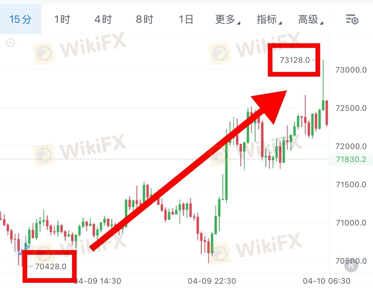 行情完全验证判断:行情自70428一线企稳启动,夜间最高触及73128,全程兑现2700点上行空间