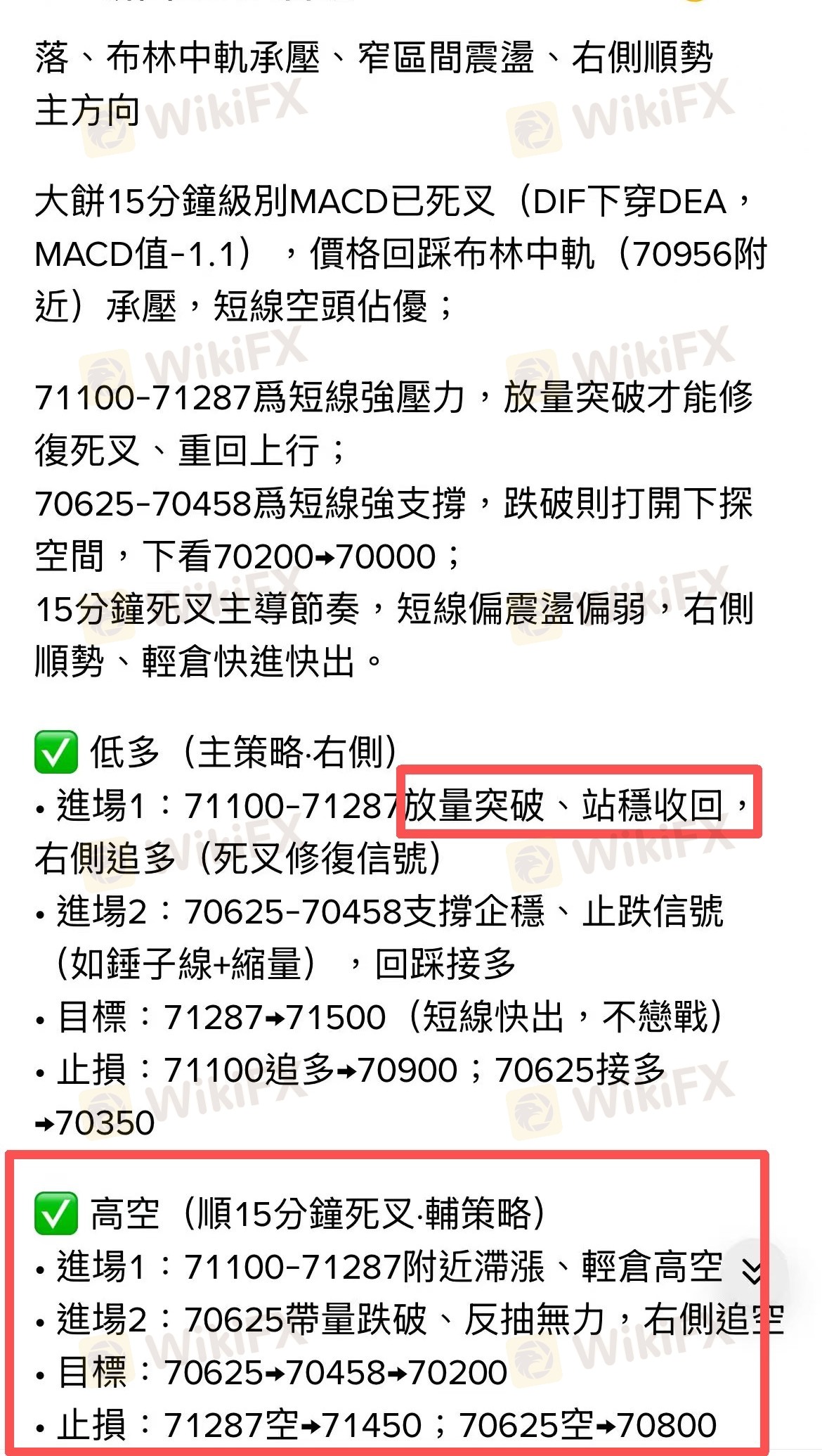 • 入场落地:要求反弹 71100-71287 滞涨再试空。价格触及 71091 后快速回落,承压信号精准触发。