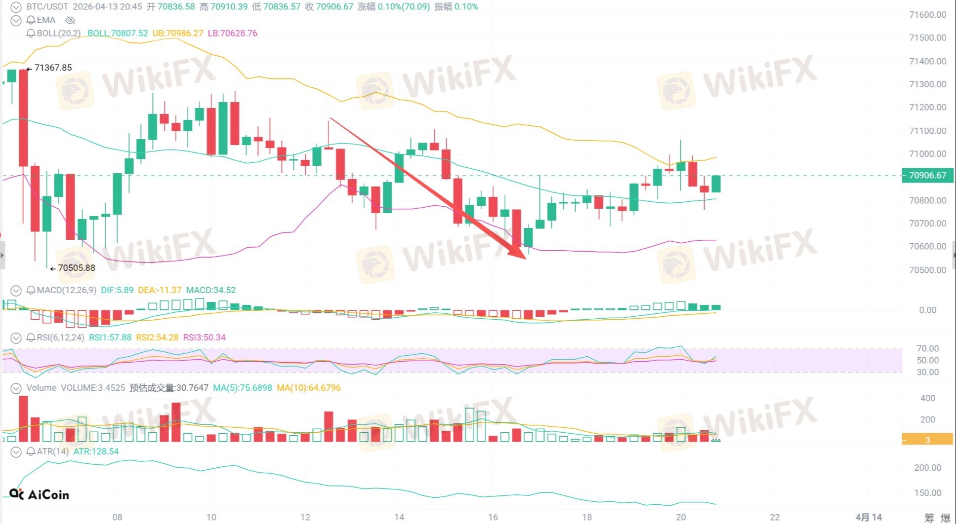 第一目标 70625-70458:价格快速下探至 70505 区间,空单顺利止盈。