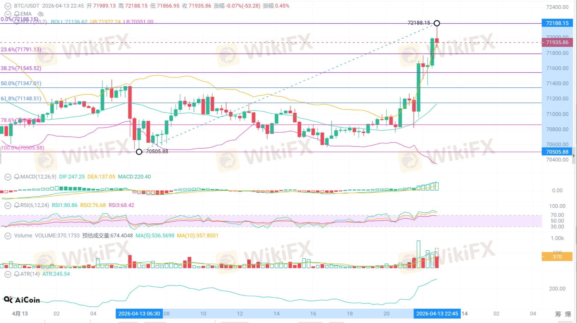 当前价格 71935,已突破前期下跌趋势线,站上斐波那契23.6%压力位,最高触及 72188;