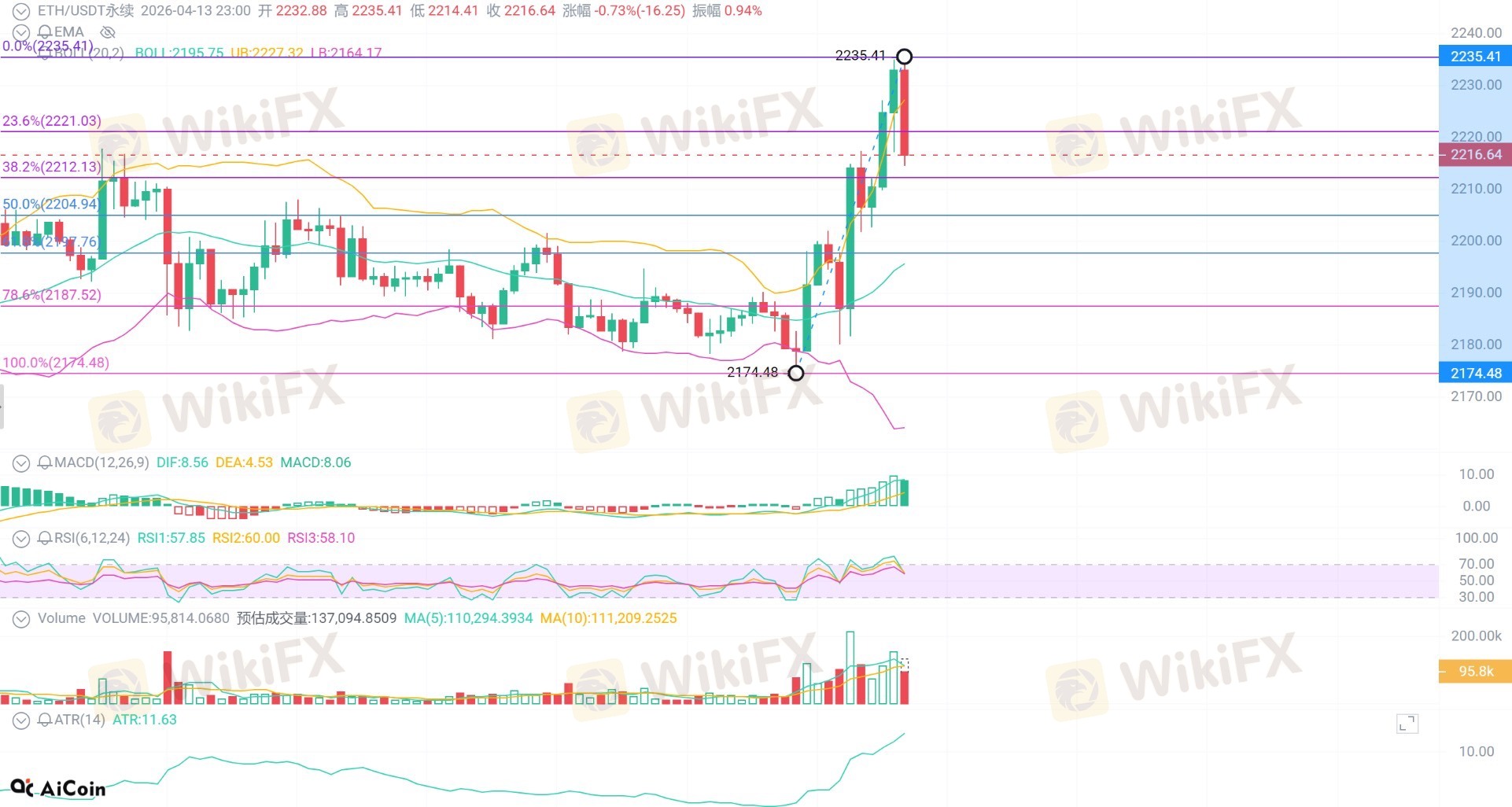 当前价格 2216.64,已突破前期下跌趋势线,站上斐波那契23.6%压力位,最高触及 2235.41;