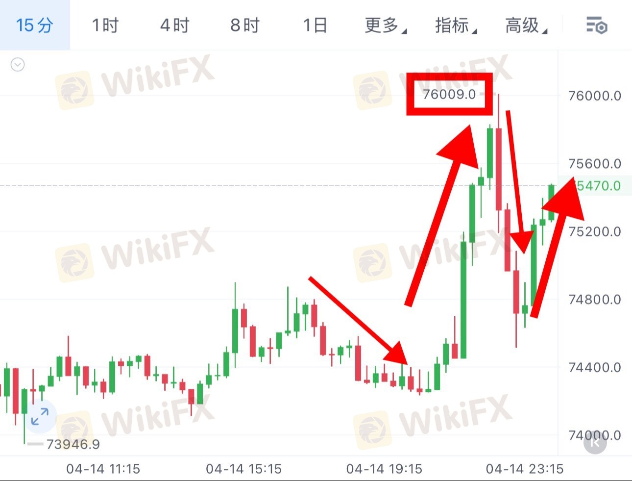 晚间再度冲高至第二关键压力76000区域后二次承压下行,走出一千五百点行情空间。