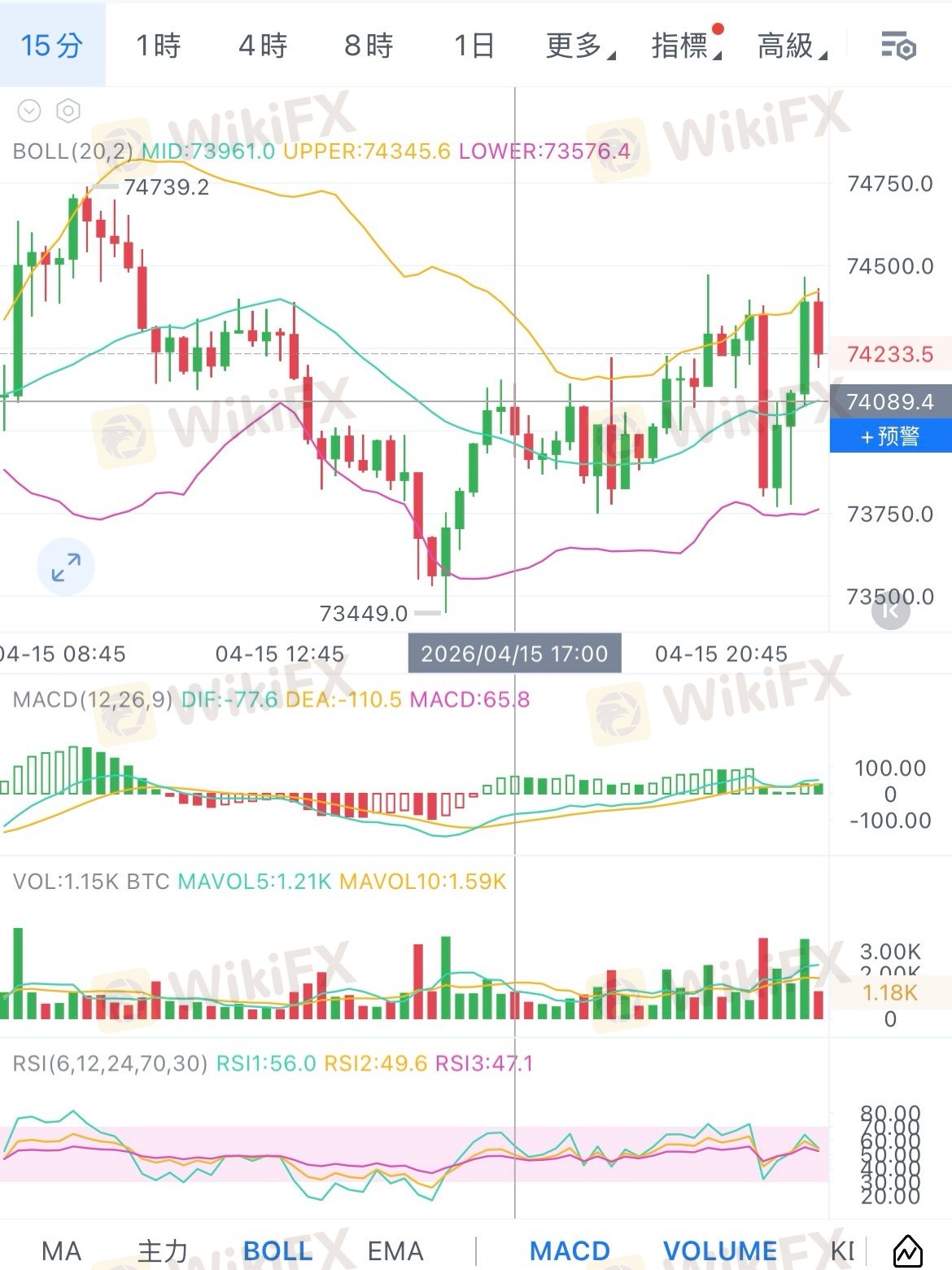 • 目標:73800(1小時布林中軌)→ 73500(15分鐘布林下軌+近期震盪中樞)