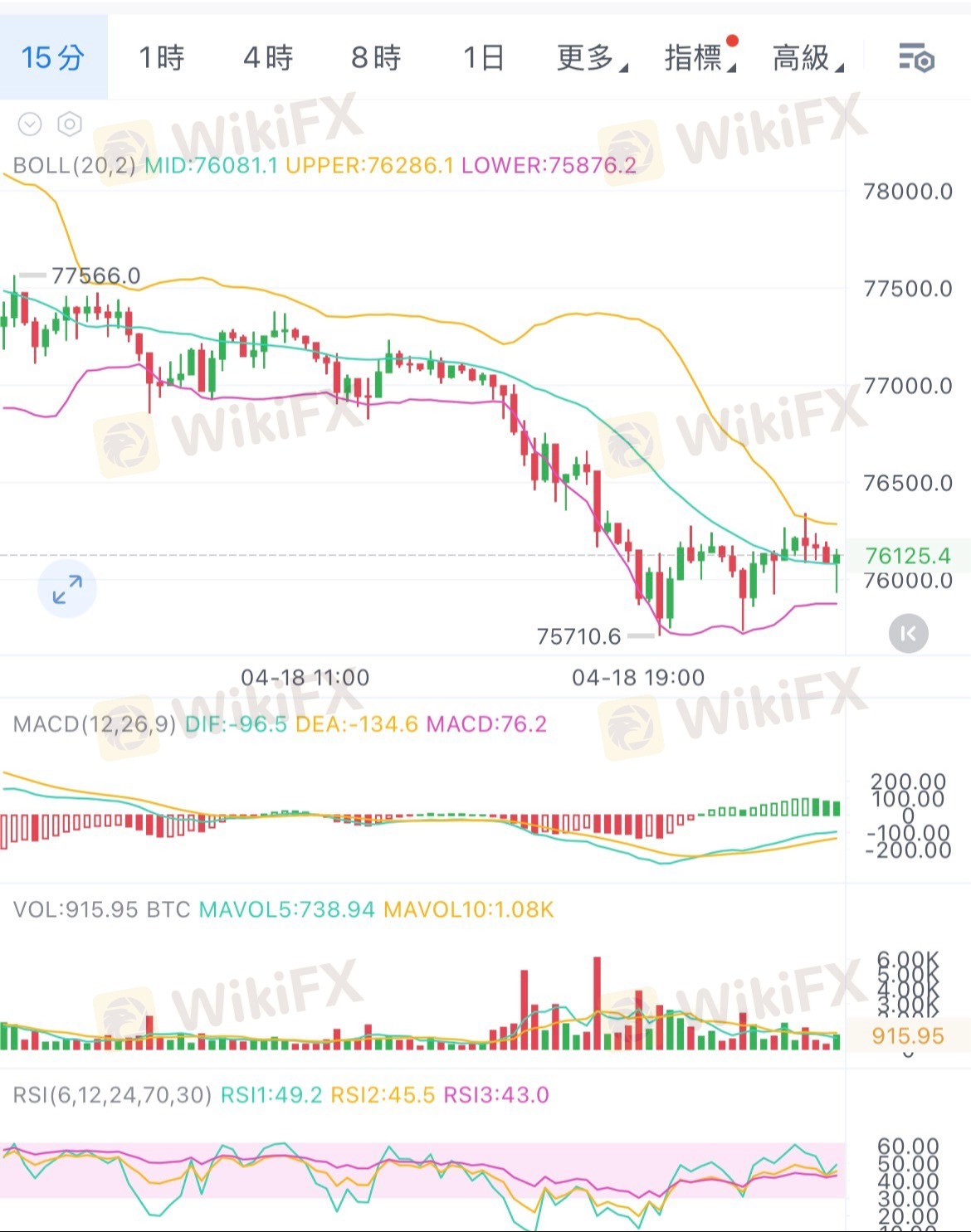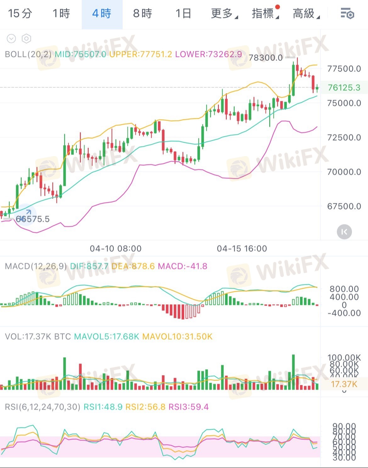• 布林带:价格反弹至布林中轨(76081)附近,布林上轨向下压制,反弹遇阻信号明显。
