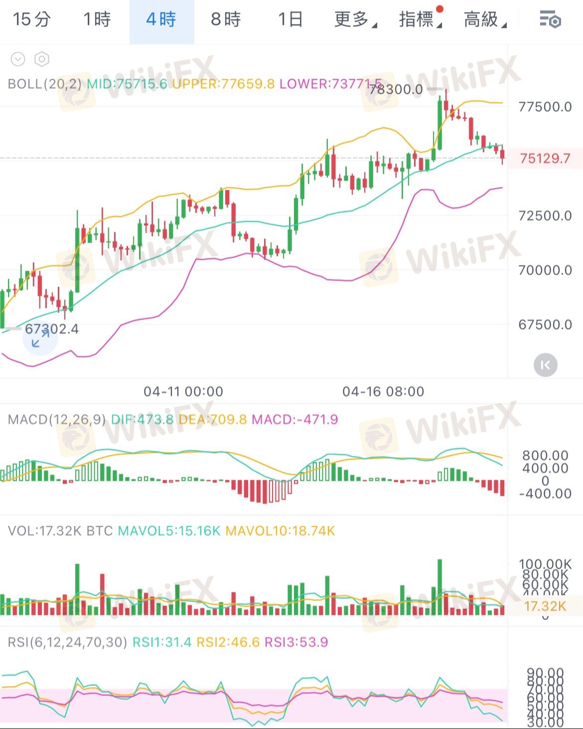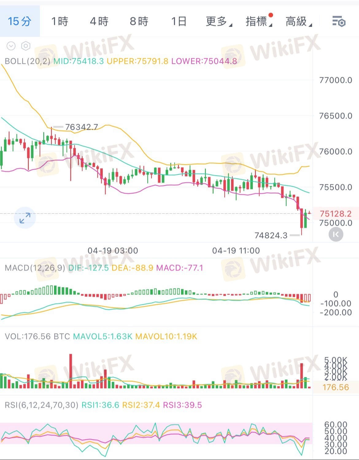 支撐:15分鐘圖顯示低點74824.3,疊加4小時布林帶下軌73771構成強支撐區間,74800-75000是午間多頭防守核心區