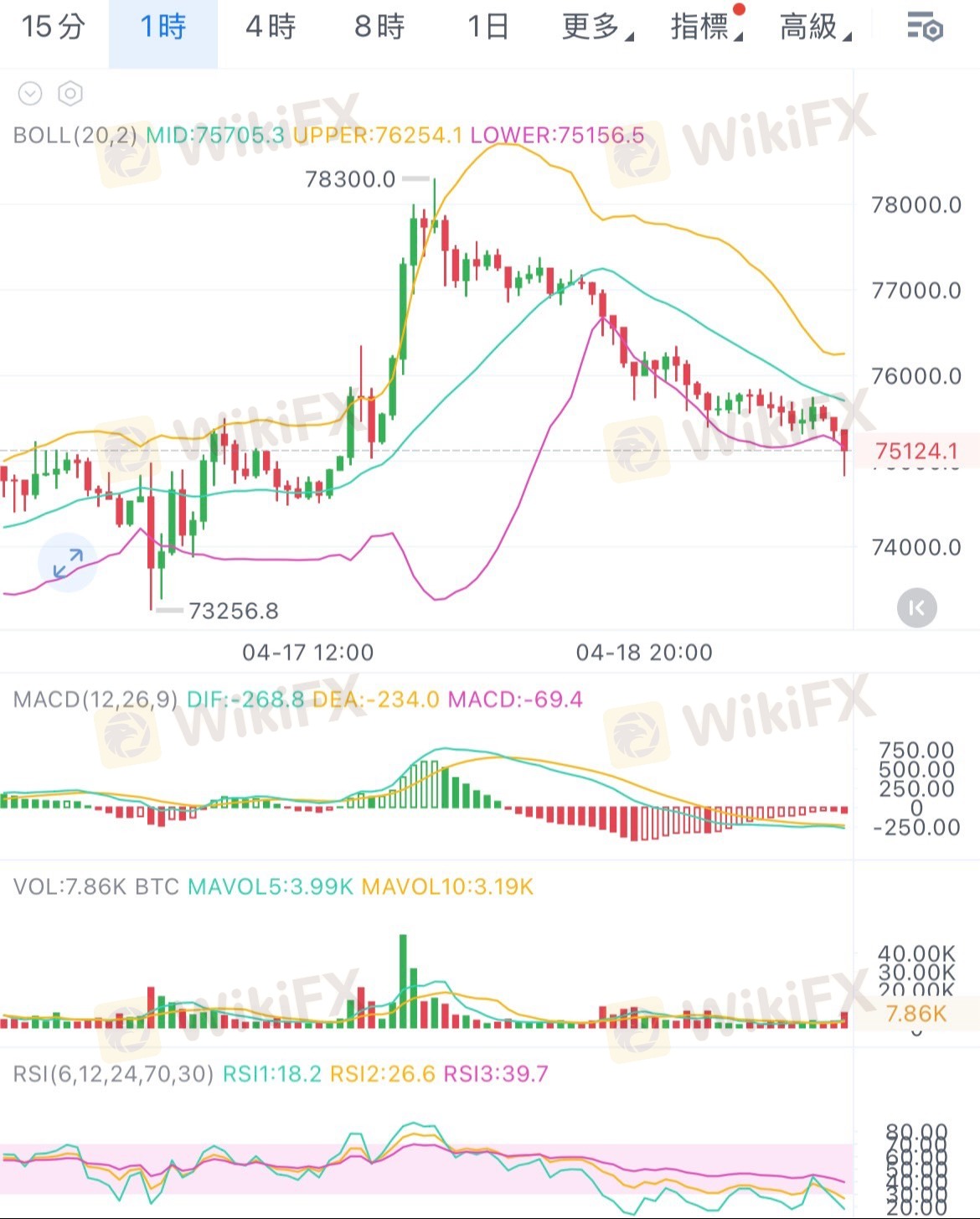 1. 趨勢與結構:早盤衝高至77004.2後快速回落,4小時、1小時週期均形成短期下行趨勢,價格跌破布林帶中軌(4小時MID:75715.6、1小時MID:75705.3),短期多頭主導地位暫時弱化,處於正常回調消化範疇。