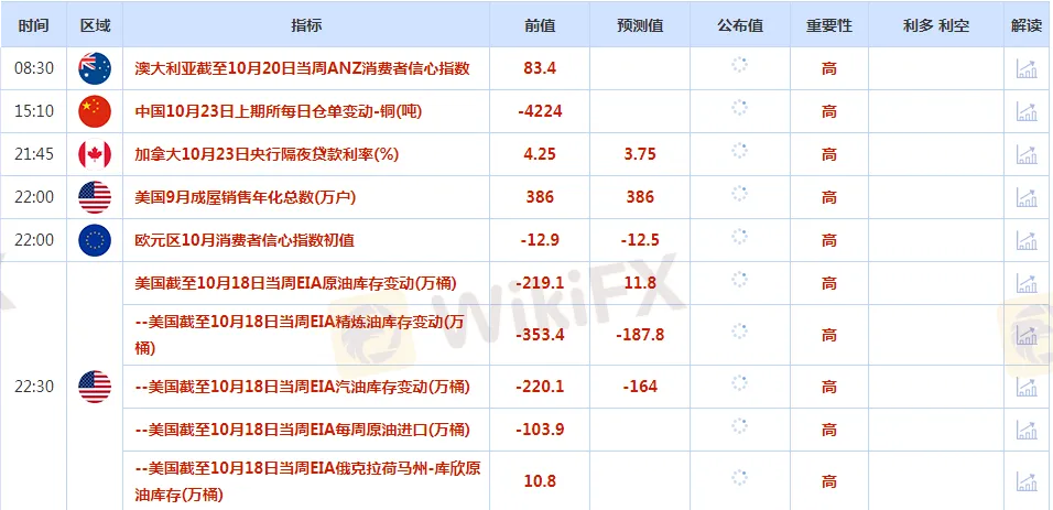 摘要:CWG Markets市場資訊2024年10月23日(週三):匯訊摘要:週二,因市場預期美聯儲將放緩降息步伐,同時投資者在膠著的美國總統大選前調整倉位,美元指數衝上104關口上方,創下兩個半月新高,延續近期升勢,最終收漲0.09%,報104.07。基準的10年期美債收益率收報4.2140%;對貨幣政策更敏感的兩年期美債收益率收報4.0430%。週二現貨黃金續刷紀錄新高,並一度逼近2750關口,最終
