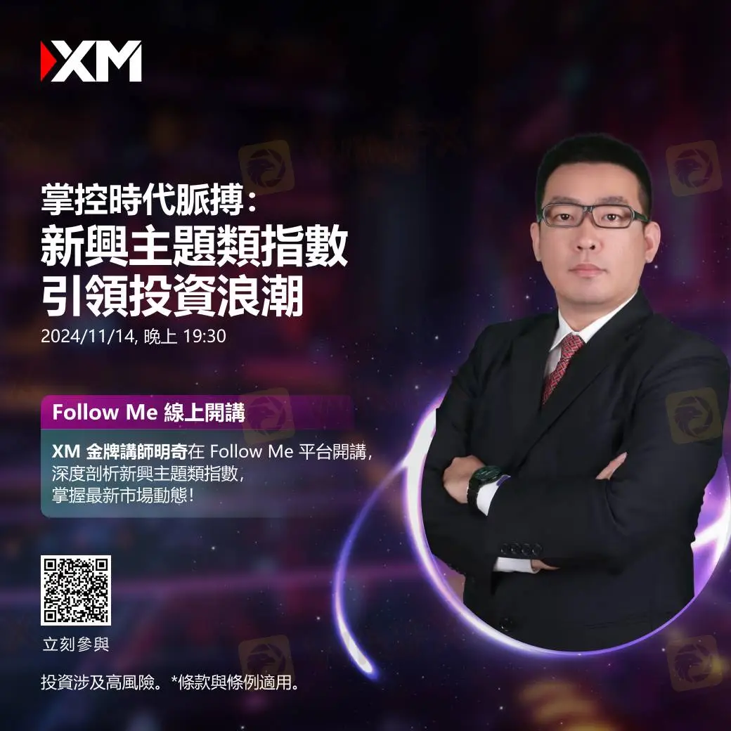 摘要:想要抓住市場最新趨勢?千萬不要錯過 XM 金牌講師 - 明奇老師帶來的精彩線上直播課程!他將在 Follow Me 上直播,為你深度解析新興主題類指數的投資奧秘,帶你掌握市場前沿動態。2024年11月14日,當地時間晚上19:30,聚焦最新的熱門指數,幫助你洞悉未來潛力行業,精準布局投資策略!無論你是新手還是資深交易者,都能從中獲得深刻的市場見解和實用技巧。掃描下方 QR Code,跟隨明奇老師,
