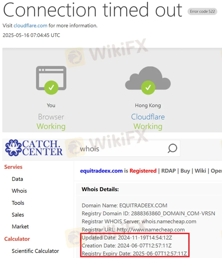 原本我們打算進入Equitrade Capital的官網了解更多情形,結果發現網站已經無法連線。使用CATCHCENTER查詢這個網站,可以看到其設立時間是2024/6/7,在2024/11/19更新過,至今只有半年,而且預計在2025/6/7註冊到期。結合目前的情況來看,基本上可以確定已經爆雷跑路,但不排除有開新網站繼續行騙的可能性,還請所有投資人務必提高警覺,以免受害。