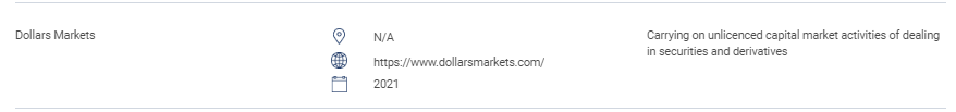 “本節包含未經授權的網站、投資產品、公司和個人的清單。該清單包括:未經 SC 許可而從事或自稱從事以下受監管活動的人:證券交易;衍生品交易;基金管理;就企業融資提供建議;投資建議;財務規劃;以及私人退休計劃交易。未經授權經營公認市場的人。未經批准、授權或認可發行或發行證券的人。濫用 sc 的徽標和歪曲 sc 的人。 “ Dollars Markets n/a https://www.dollarsmarkets.com/ 2021 進行未經許可的資本市場交易證券和衍生品活動