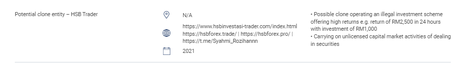 “本節包含未經授權的網站、投資產品、公司和個人的列表。該列表包括:未經 SC 許可進行或自稱進行以下受監管活動的人員:證券交易;衍生品交易;以及基金管理; 企業財務諮詢; 投資建議; 財務規劃;以及 私人退休計劃交易。 未經授權經營認可市場的人員。 未經批准、授權或認可發行或發行證券的人員。 濫用 SC 徽標並歪曲 SC 的人員。 “ 潛在克隆實體 – HSB Trader 不適用 https://www.hsbinvestasi-trader.com/index.html https://hsbforex.trade/ | https://hsbforex.pro/ | https://t.me/Syahmi_Rozihannn 2021 • 可能克隆經營非法投資計劃,提供高額回報,例如投資 RM1,000 在 24 小時內回報 RM2,500 • 進行未經許可的證券交易資本市場活動