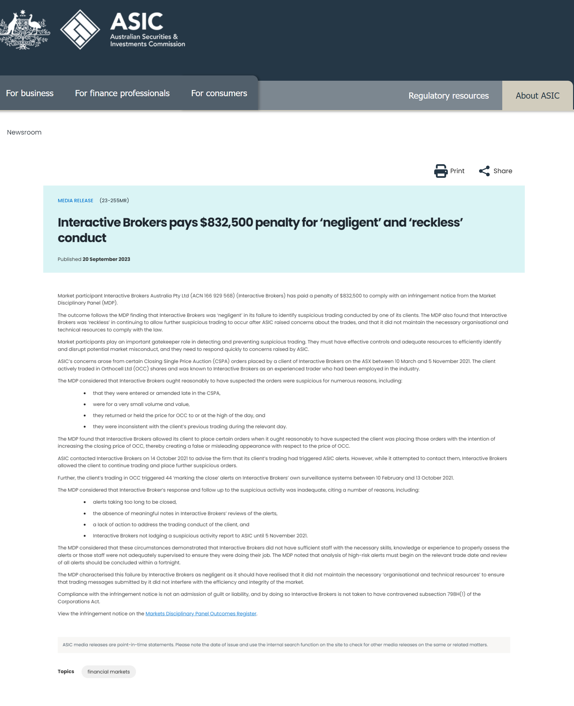 媒體發布(23-255mr) 盈透證券因 2023 年 9 月 20 日發布的「疏忽」和「魯莽」行為支付 832,500 美元的罰款 盈透證券澳洲有限公司 (acn 166 929 568) ( 盈透證券 ) 已支付 832,500 美元的罰款,以遵守市場紀律小組 (Mdp) 的違規通知。結果遵循 MDP 的發現: 盈透證券未能識別其一名客戶進行的可疑交易是「疏忽」。民主黨還發現 盈透證券在澳洲證券監管委員會(ASIC)對這些交易提出擔憂之後,該公司繼續允許進一步的可疑交易發生是“魯莽的”,並且它沒有保留遵守法律所需的組織和技術資源。市場參與者在發現和防止可疑交易方面發揮著重要的把關人作用。他們必須擁有有效的控制和充足的資源,以有效地識別和破壞潛在的市場不當行為,並且需要對澳洲證券監管委員會提出的擔憂做出快速反應。澳洲證券投資委員會(ASIC)的擔憂源自於某客戶所下的某些收盤單一價格拍賣(cspa)訂單 盈透證券2021 年 3 月 10 日至 11 月 5 日期間,客戶在澳洲證券交易所積極交易 orthocell ltd (occ) 股票,並已知 盈透證券作為一名曾在該行業工作過的經驗豐富的交易員。民主黨認為 盈透證券有理由懷疑這些訂單是可疑的,原因有很多,包括:這些訂單是在 cspa 中較晚輸入或修改的,數量和價值都非常小,他們將 OCC 的價格退回或保持在最高價或最高價。日,且與客戶在相關日之前的交易不一致。民主黨發現 盈透證券當其理應懷疑客戶下訂單的目的是提高 OCC 的收盤價時,卻允許其客戶下某些訂單,從而對 OCC 的價格造成虛假或誤導性的表象。聯繫asic 盈透證券 2021 年 10 月 14 日通知該公司,其客戶的交易已觸發 ASIC 警報。然而,當它試圖聯繫他們時, 盈透證券允許客戶繼續交易並下進一步的可疑訂單。此外,客戶的 OCC 交易觸發了 44 個「平倉」警報 盈透證券' 自己的監控系統在2021 年2 月10 日至10 月13 日之間進行。Mdp 認為,互動式經紀商對可疑活動的反應和後續行動不夠充分,並列舉了多種原因,包括:警報關閉時間過長、缺乏有意義的註解在 盈透證券' 對警報的審查,缺乏解決客戶交易行為的行動,以及 盈透證券直到 2021 年 11 月 5 日才向 asic 提交可疑活動報告。mdp 認為這些情況表明 盈透證券沒有足夠的具有必要技能、知識或經驗的工作人員來正確評估警報,或者這些工作人員沒有受到充分的監督以確保他們做好自己的工作。 MDP 指出,高風險警報的分析必須在相關交易日期開始,所有警報的審查應在兩週內完成。民主黨將這次失敗描述為 盈透證券它應該意識到自己沒有保持必要的「組織和技術資源」來確保其提交的交易資訊不會幹擾市場的效率和完整性,這是疏忽大意的。遵守侵權通知並不意味著承認有罪或承擔責任,並且這樣做 盈透證券不被視為違反公司法第 798h(1) 款。查看市場紀律小組結果登記冊上的違規通知。 ASIC 媒體發布的內容都是時間點聲明。請注意發布日期,並使用網站的內部搜尋功能來尋找其他媒體發布的相同或相關事項。